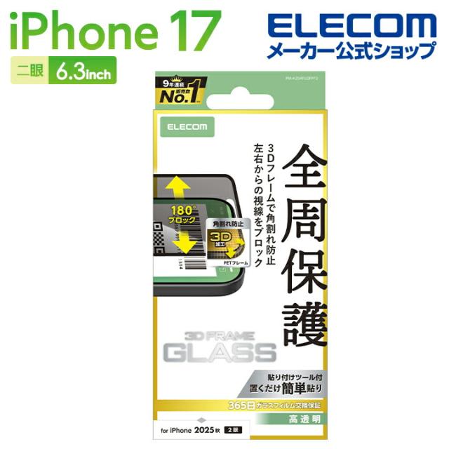 エレコム iPhone 17 用 ガラスフィルム フレーム付 のぞき見防止 左右 iPhone17 ガラス 液晶 保護フィルム ┃PM-A25AFLGFPF2