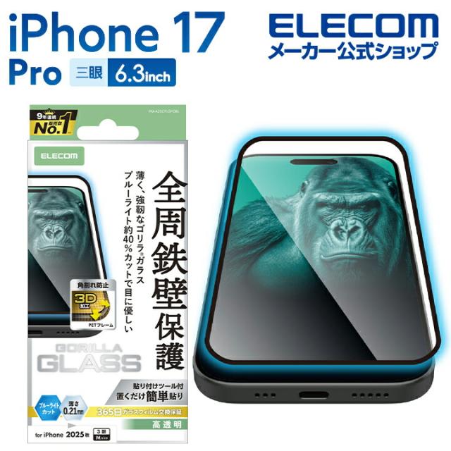 エレコム iPhone 17 Pro 用 ガラスフィルム フレーム付 ゴリラ 0.21mm ブルーライトカット iPhone17 Pro ガラス 液晶 保護フィルム ┃PM-A25CFLGFOBL