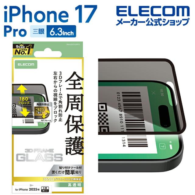 エレコム iPhone 17 Pro 用 ガラスフィルム フレーム付 のぞき見防止 左右 iPhone17 Pro ガラス 液晶 保護フィルム ┃PM-A25CFLGFPF2