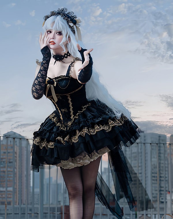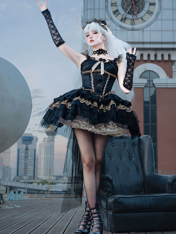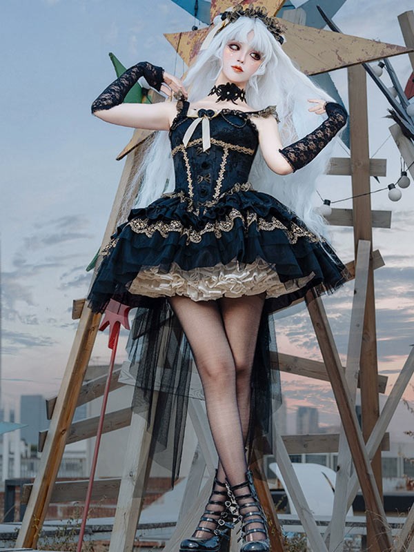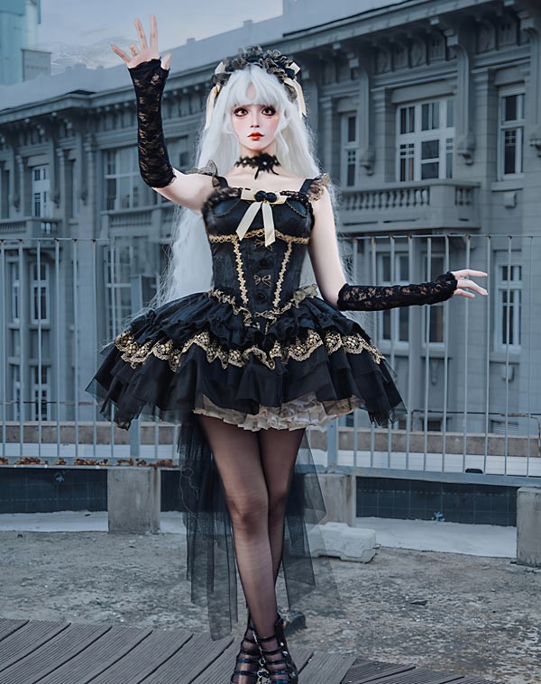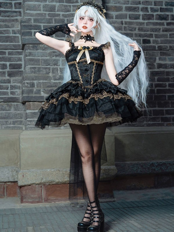 ワンピース ロリータ ハロウィン バレエコア風 ショート丈 ミニ レディース ノースリーブ ゴスロリ ゴシック 暗黒風 ロリィタファッション リボン レース フリル コスチューム コスプレ 衣装 仮装 可愛い パーティー 文化祭 イベント ゴールド ブラック 黒 S M L mj005m4m4zu