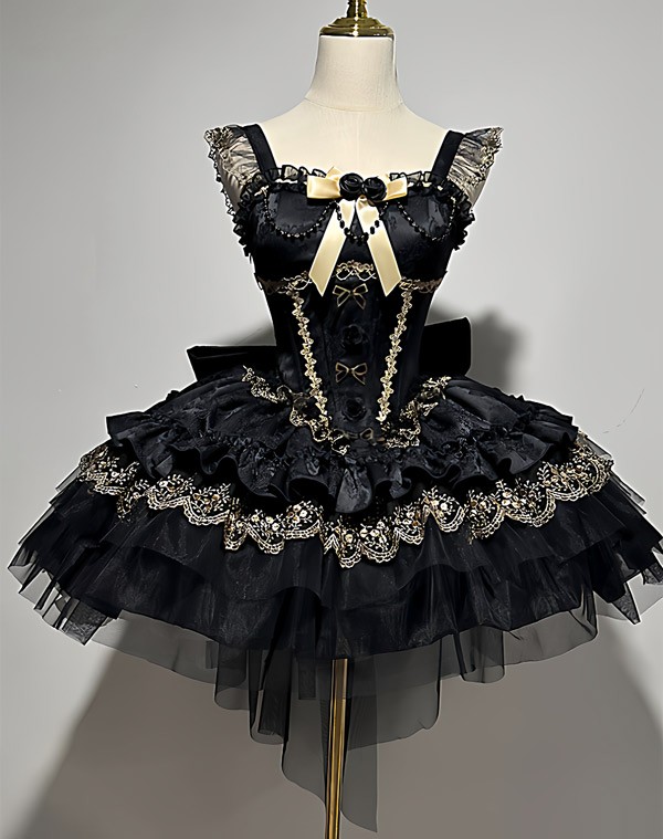 ワンピース ロリータ ハロウィン バレエコア風 ショート丈 ミニ レディース ノースリーブ ゴスロリ ゴシック 暗黒風 ロリィタファッション リボン レース フリル コスチューム コスプレ 衣装 仮装 可愛い パーティー 文化祭 イベント ゴールド ブラック 黒 S M L