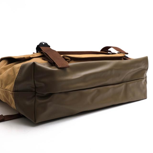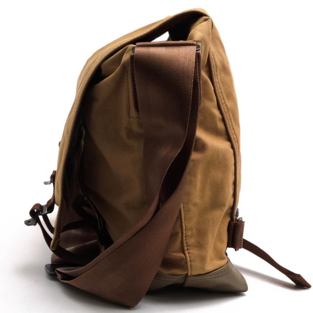 ミリタリーのダッフルバッグをモチーフに四角いフォルムと50mmの幅広テープが特徴のカジュアルシリーズ。コットンキャンバスの表地は、綿のモッサリ感を最大限に活かすため、余計な処理はせず自然体の風合いを維持。底面は汚れに強いレーヨンオックス(PVCコーティング)を使用。メイン収納部はヴィンテージ風のTALONジップで開閉可能で、手頃なサイズのポケットが1つあります。背面にもポケットを配し、収納力を確保。