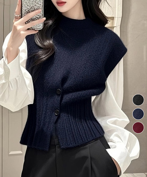 リブ切り替えとフロントボタンがアクセントになった上品なニットベスト。
