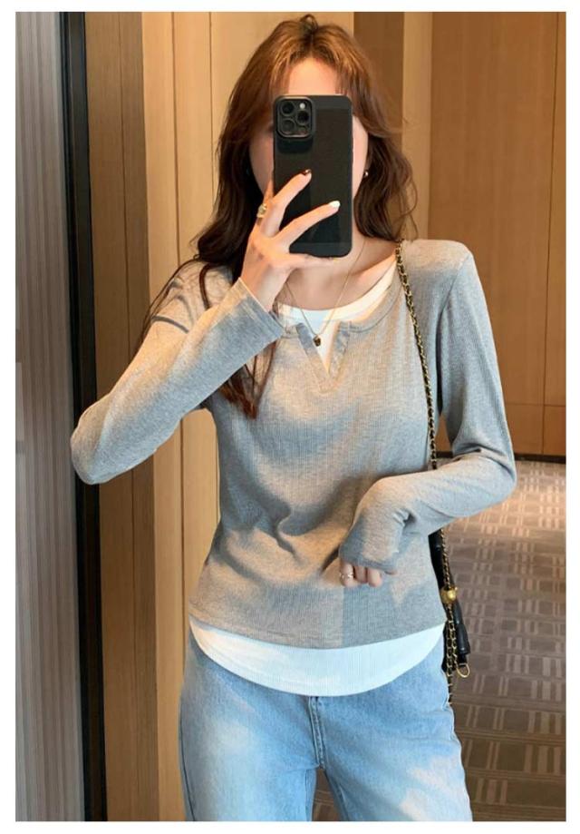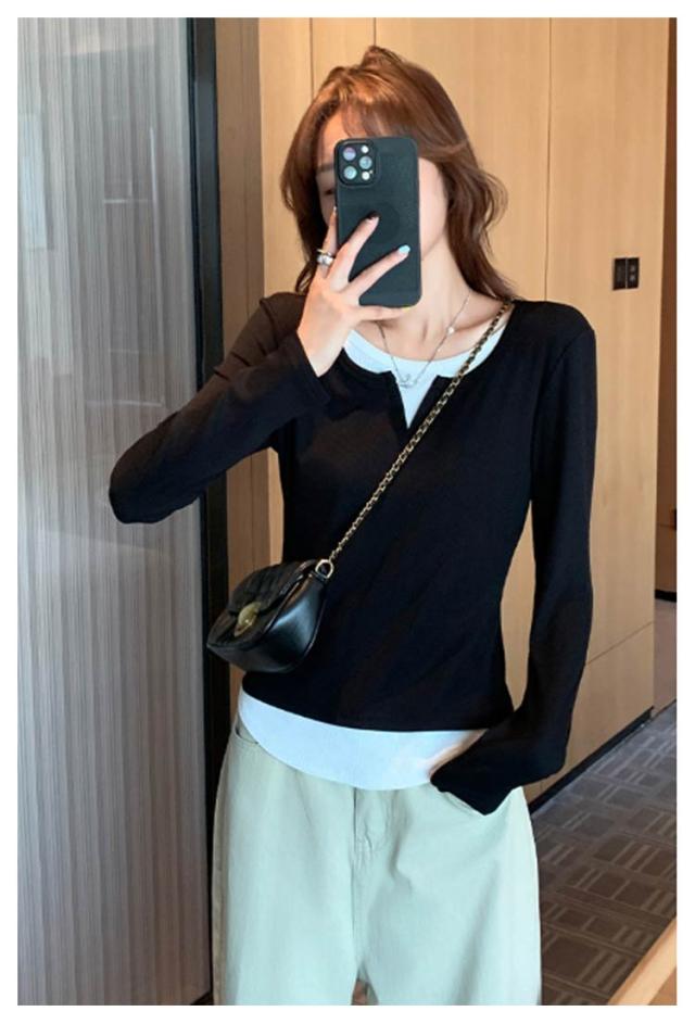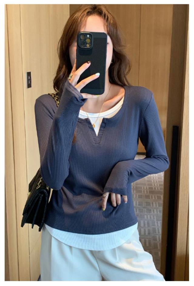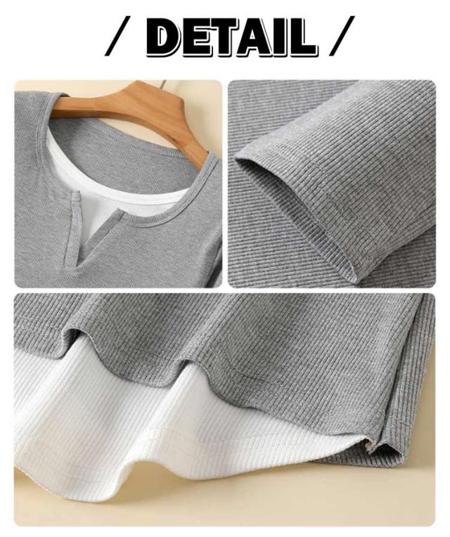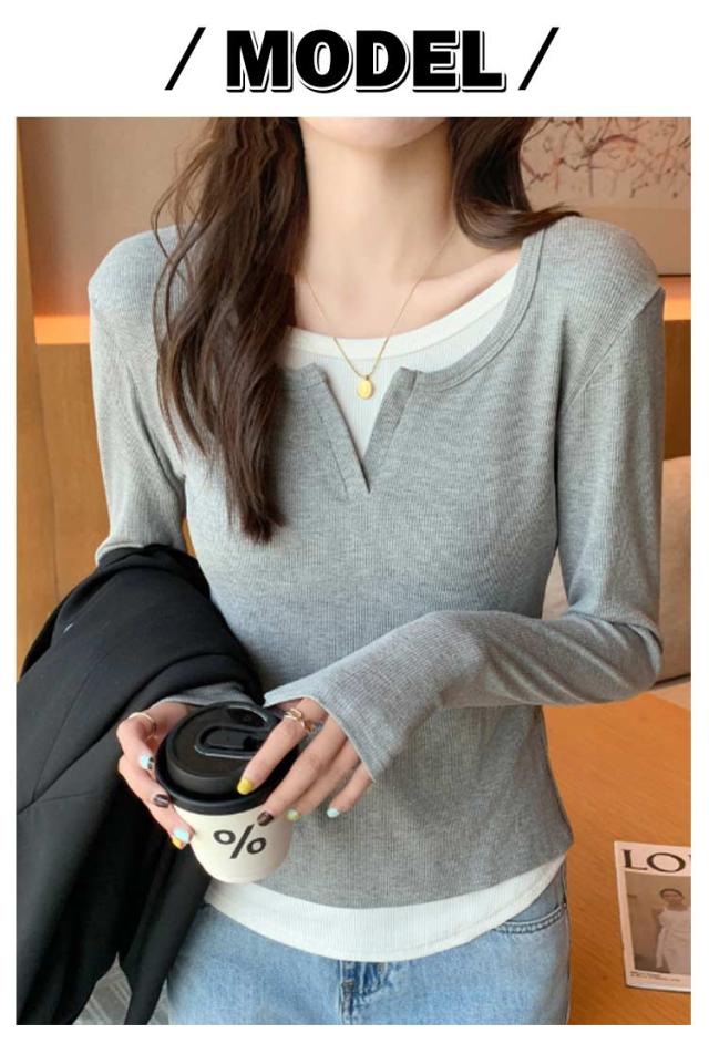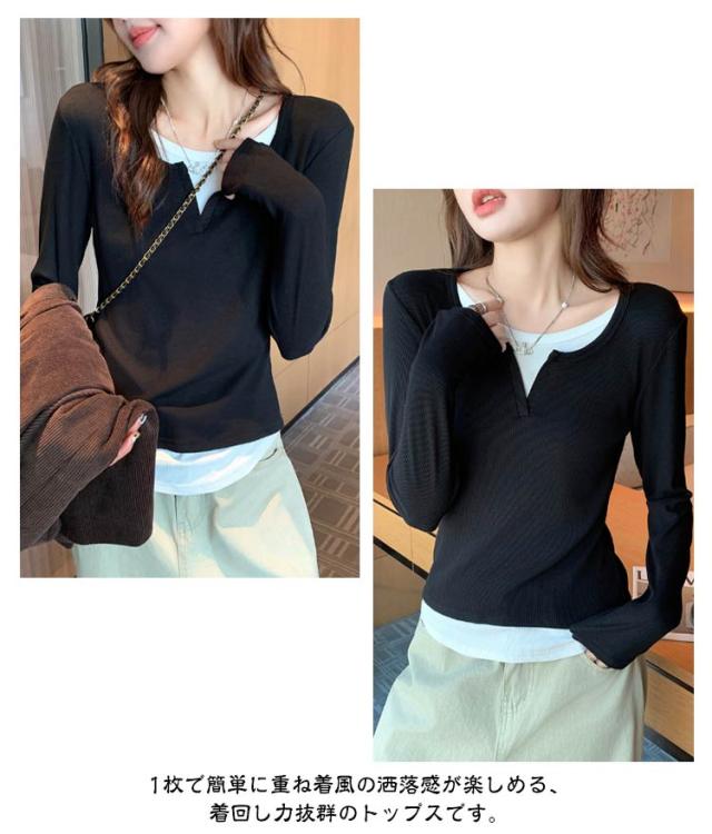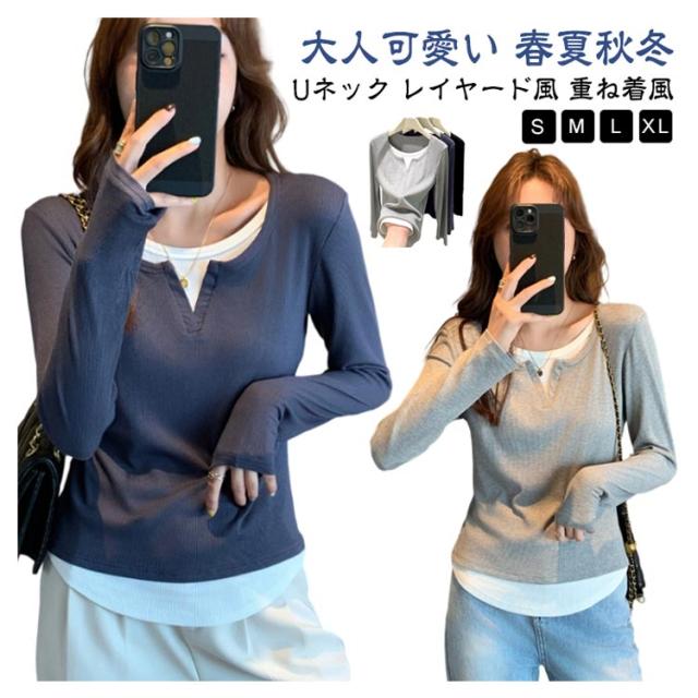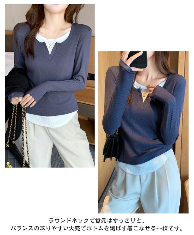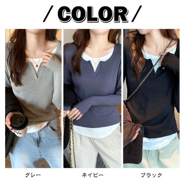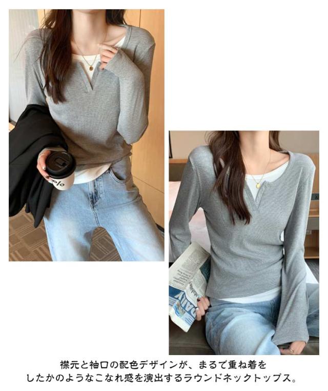 長袖 tシャツ 配色 レディース トップス 長袖 カットソー リブ生地 丸首 Uネック レイヤード風 重ね着風 かわいい おしゃれ スリム フィット コンパクト ロングtシャツ ロンT 大人可愛い きれいめ 春夏秋冬 インナー tシャツ 薄手 黒 紺 ネイビー グレー 【送料無料】