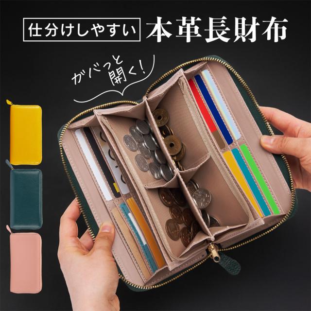 長財布 メンズ レディース 小銭入れ 仕切り 4分割 4つ 仕分け上手な本革長財布 本革 大容量 薄い 薄型 軽量 ラウンドファスナー ファスナー カード入れ 多い 札入れ 大きめ 牛革 女性 人気 シンプル おしゃれ イエロー 黄色 グリーン 緑 ピンク ブランド