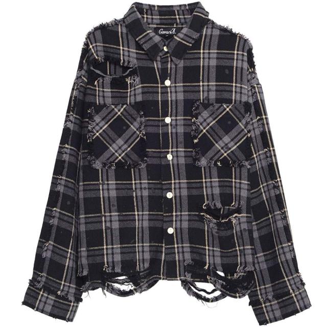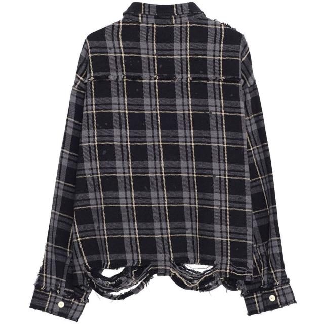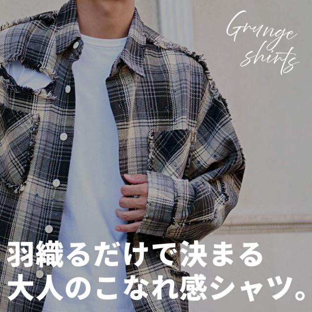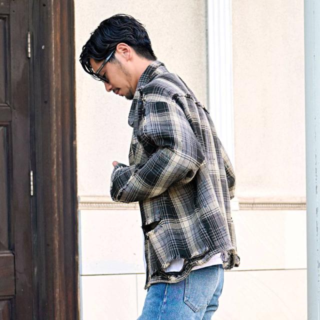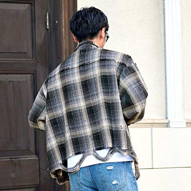 90’sストリートを思わせるオーバーサイズ感と大胆なダメージディテールで、一枚で主役級の存在感を放つ今季マストなチェックシャツです。