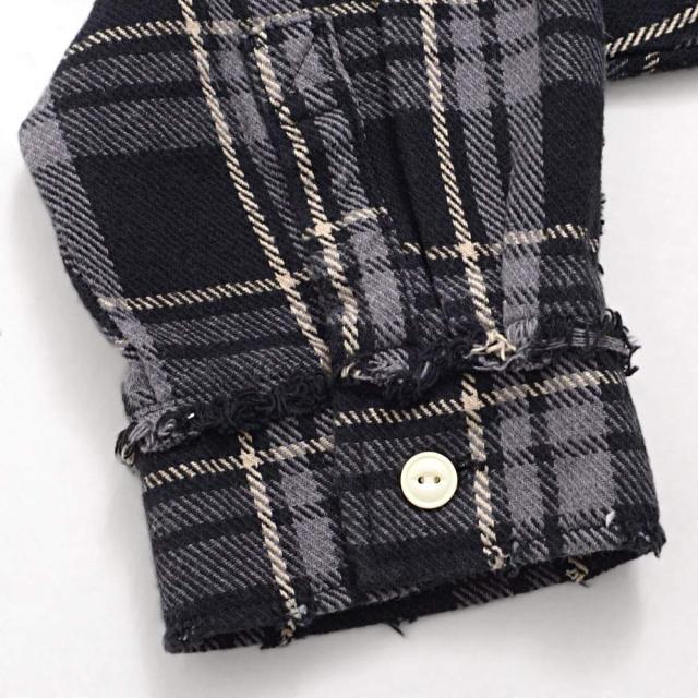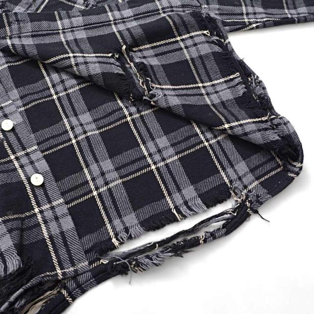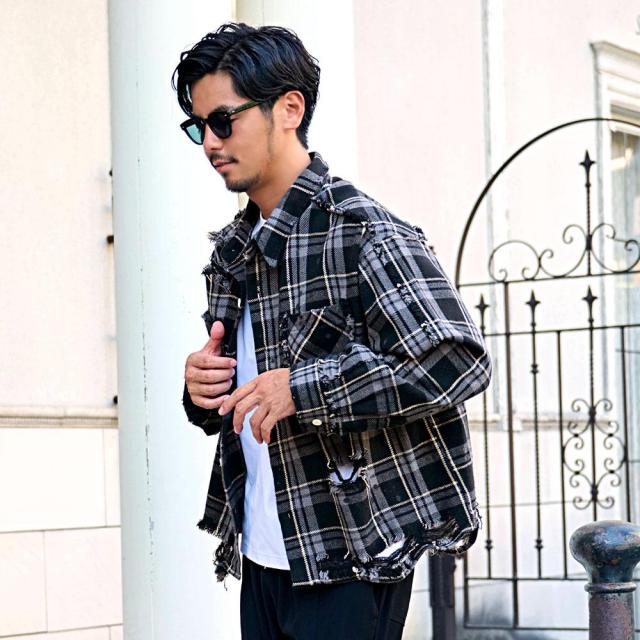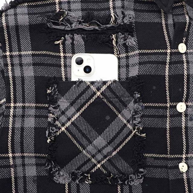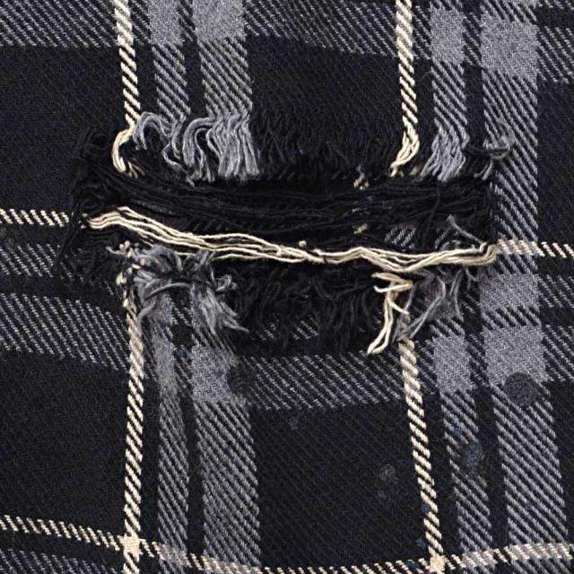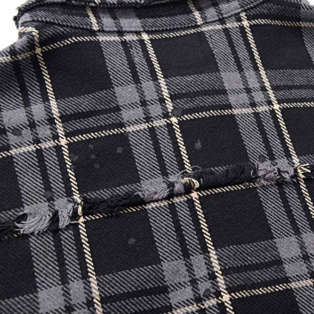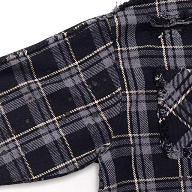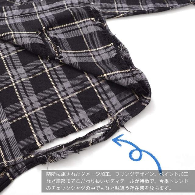 随所に施されたダメージ加工、フリンジデザイン、ペイント加工など細部までこだわり抜いたディテールが特徴で、今季トレンドのチェックシャツの中でもひと味違う存在感を放ちます。
