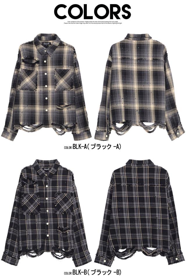 シャツ メンズ ブランド 長袖シャツ 長袖 シャツ グランジ加工 ダメージ チェックシャツ シャツジャケット ネルシャツ クラッシュ カジュアルシャツ ブラック 黒 CavariA 大人 20代 30代 40代 50代 ちょいワル ユニセックス 男性 男 服 秋 冬 秋冬 ファッション [CAFK25-02]
