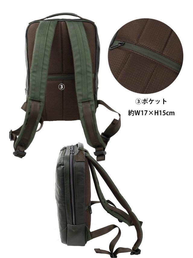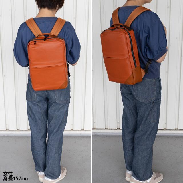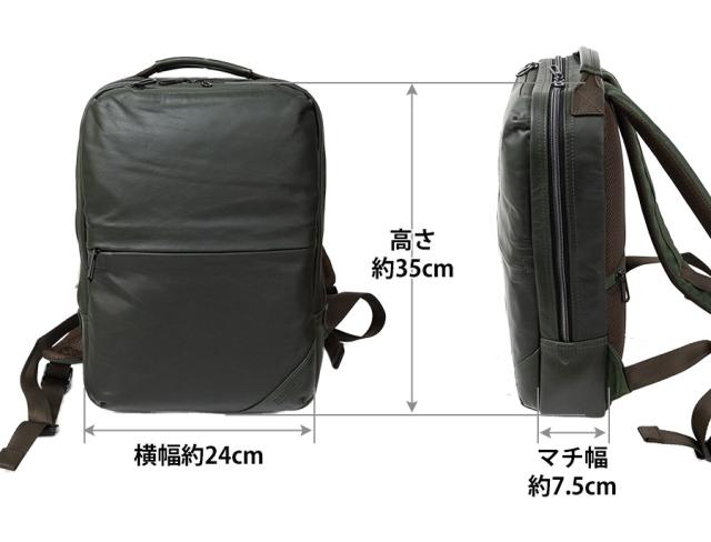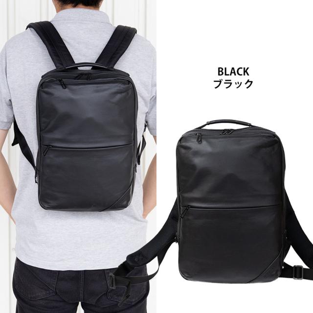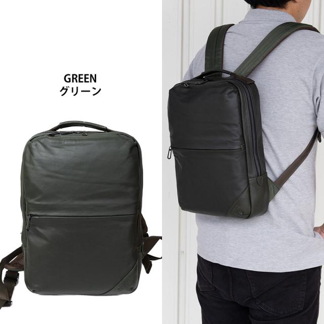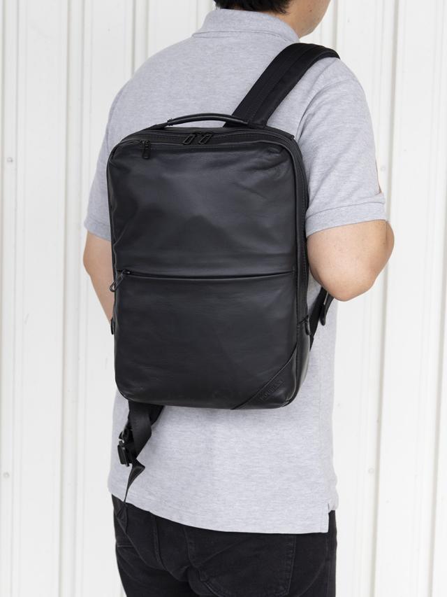 しっとりとしてマットなイタリアンソフト牛革を使ったA4ファイルジャストサイズで薄マチのリュックサックです。リュックベルトや背面とは異素材を使い約560gと本革リュックとは思えない軽さが特徴です。