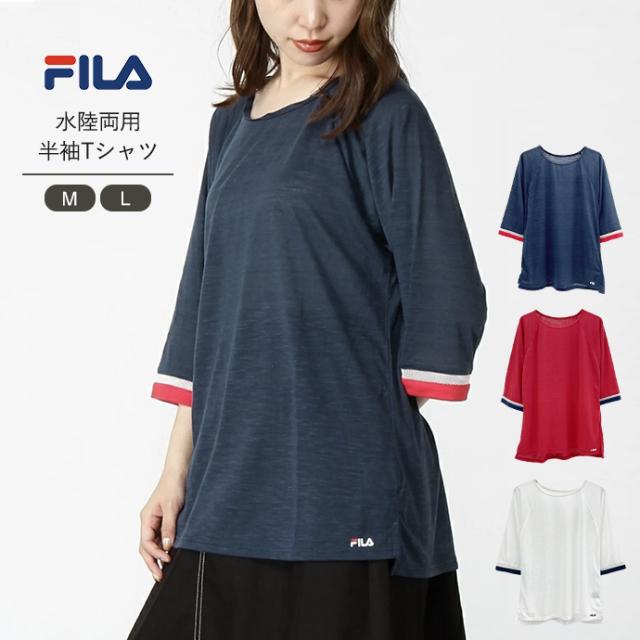 FILA フィラ トップス Tシャツ 五分丈 水陸両用 速乾 メッシュ 薄手 体型カバー サイドスリット スポーツ フィットネス トレーニング 部屋着 ルームウェア