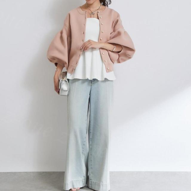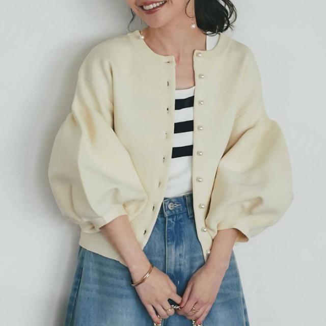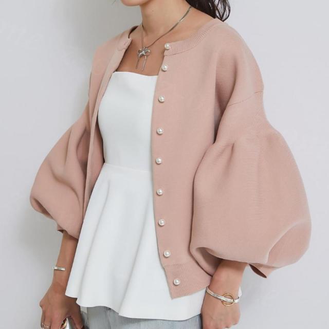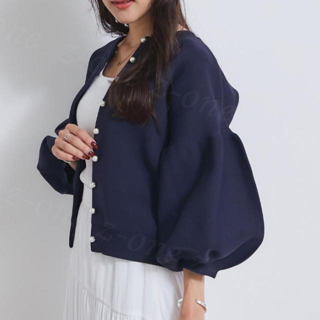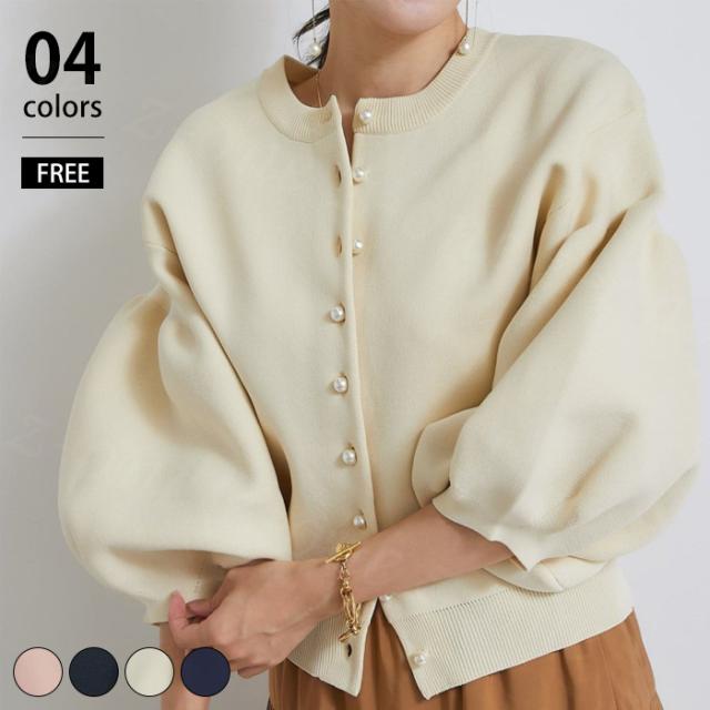 ニットカーディガン パール付き ニットコート ノーカラー カーディガン ボリューム袖 新作 送料無料 トップス アウター 羽織り シンプル 体型カバー 洗える 前開き 九分袖 ストレッチ 伸縮性 セーター ホワイトデー 卒業式