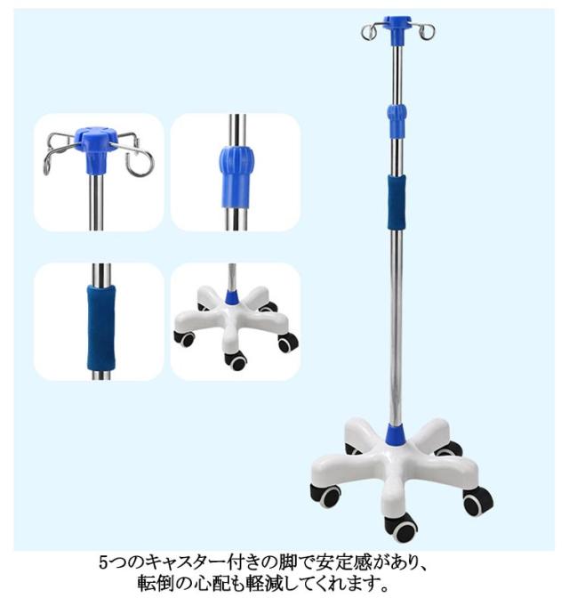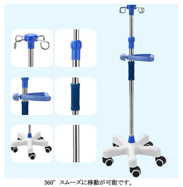 | 点滴スタンド!安定性抜群5本脚キャスター! 5つのキャスター付きの脚で安定感があり、転倒の心配も軽減してくれます。 360°スムーズに移動が可能です。 また、点滴に必要な道具など置ける便利なトレー付きです。 自由に調節が可能!子供から大人まで、ご使用頂く方の身長や使用場所に合わせて自由に高さを変更できます。 適用範囲は病院 療養院 診療所 家庭 コミュニティ 家庭看護 診療所 ペット診療所 美容院など。 | |