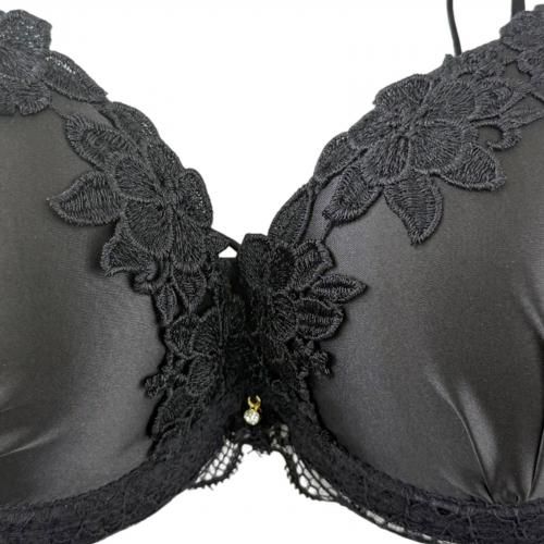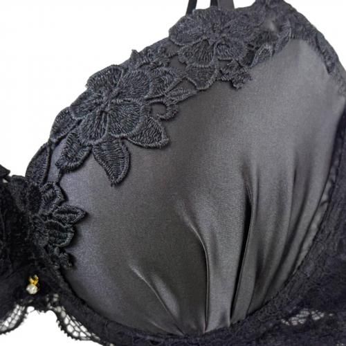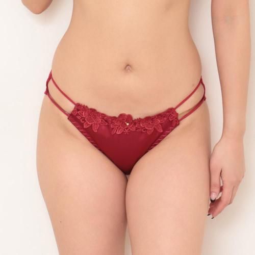 デコルテをサテンの光沢や華やかな花柄レースが彩り、クロスストリングがシャープでスタイリッシュなデザイン。