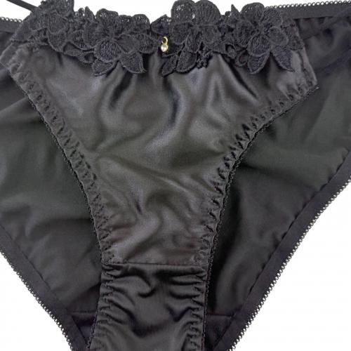 ショーツはヒップをすっぽり包み込み、ブラ同様にサイドストリングや花柄レースが目を惹きます。
