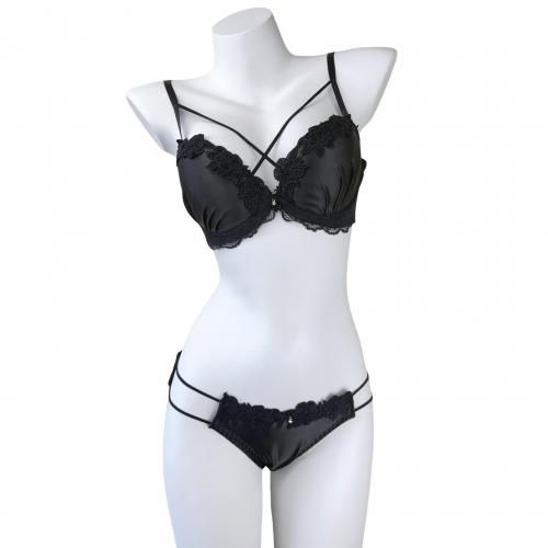 クロスストリングとレースが華やかに胸元を彩るブラ・ショーツセット(ブラセット)。