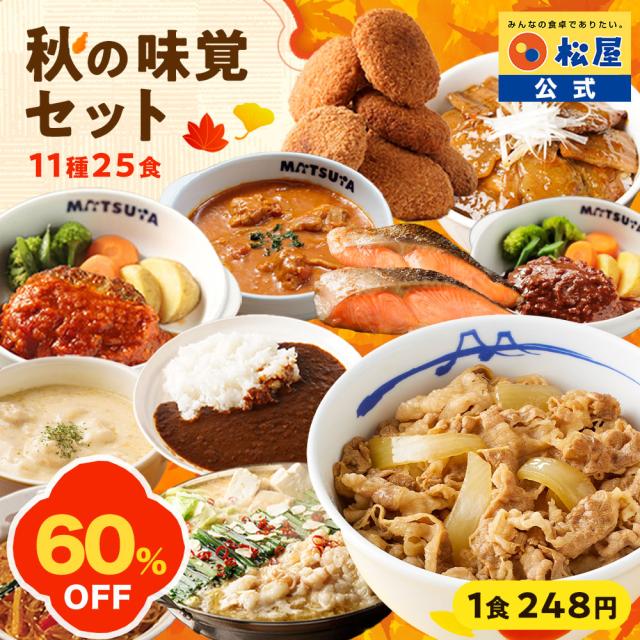 【1食248円!衝撃の60%OFF!単品合計価格15,780円→6,190円!】 松屋 公式 秋の味覚セット11種25食 新商品セット 牛めし 牛丼の具 福袋 セット 2026 まつや 牛丼 食品 グルメ 冷凍 冷凍食品 送料無料 おかず 惣菜 業務用 お弁当 レンチン 非常食 ご飯のお供 セール 半額