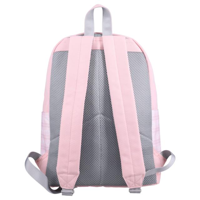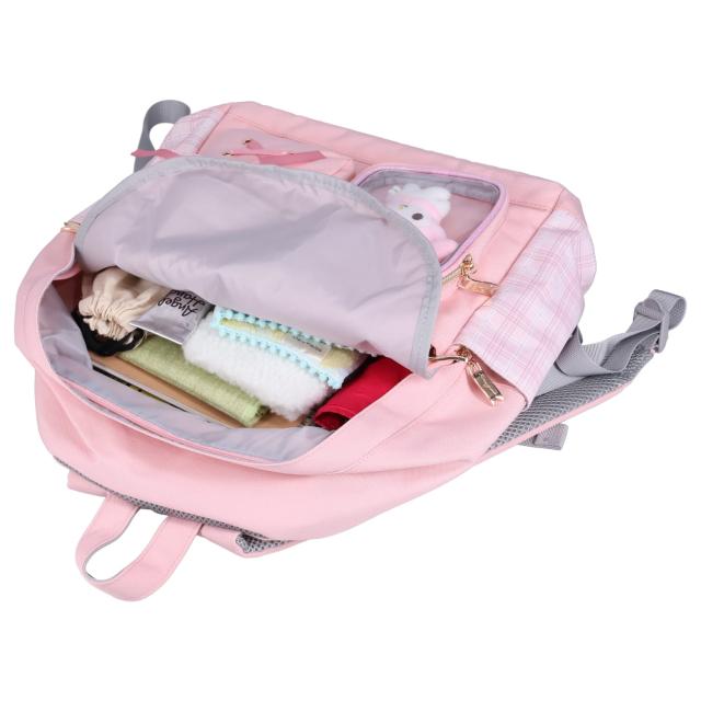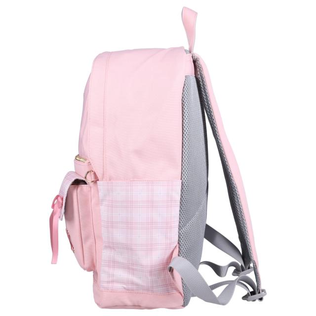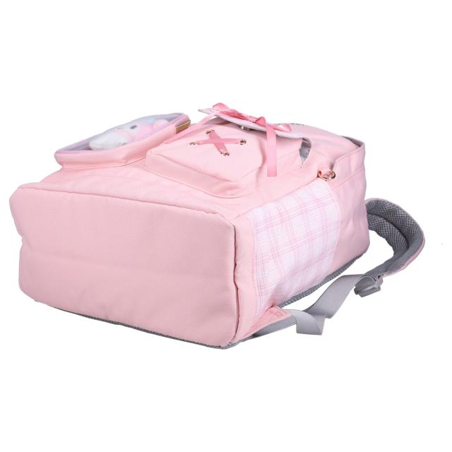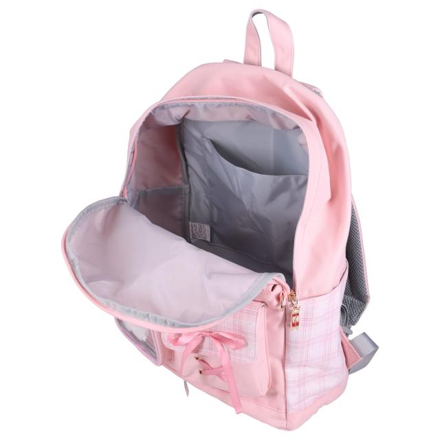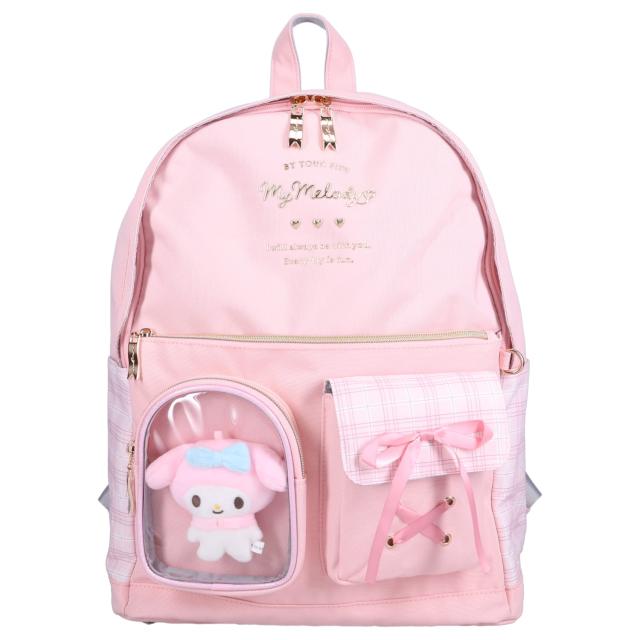 サンリオの女の子向けディパックです。クロミやシナモロールなどのキャラクターをモチーフにしたデザインで、本体はチェック柄と合皮素材を組み合わせています。フロント部分にはキャラクターのぬいぐるみとリボンが付いており、その下にあるクリアポケットには、お気に入りの缶バッジやキーホルダーを入れて“推し活”を楽しむことができます。通学や習い事など、日常使いにぴったりの商品です。