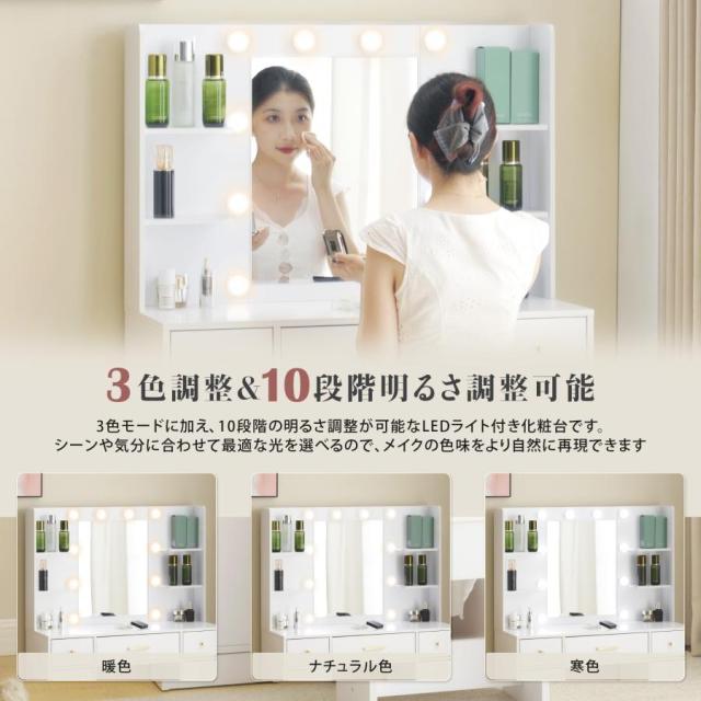 【1台で完結!多機能メイクアップデスク】照明付き女優ミラー、広々としたデスクスペース、引き出し収納、USBポート、ドライヤーホルダーなどが一体となったメイクアップデスク。3色切替可能なLEDライトで、明るさを10段階で調整でき、快適なメイク環境を提供します。