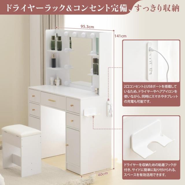 「クーポン配布中」ドレッサー 化粧台 テーブル 鏡台 ライト付き 3色LED ドライヤーホルダー コンセント付き 女優ミラー 引き出し 収納 椅子 セット サイド収納 メイク台 シンプル 大容量 可愛い 一人暮らし バレンタイン プレゼント