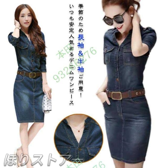 おしゃれ Hライン 長袖 無地 ワンピース タイト 膝丈 長袖ワンピース デニムワンピース デニムワンピース ワンピ 半袖 きれいめ デニム 半袖ワン