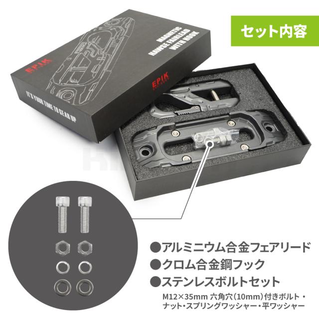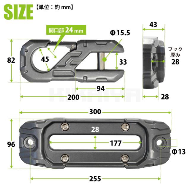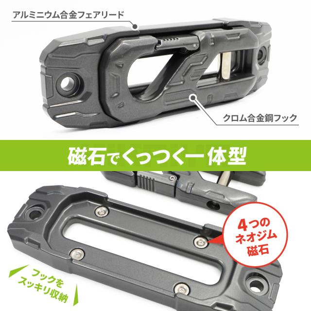 シンセティックロープの摩擦軽減に! ヘビーデューティなデザイン ●アルミニウム合金製のフェアリードと、クロム合金鋼製フックのセットです ●フェアリードに4つのネオジム磁石が埋め込まれており、磁力でフックを保持 ●一体型になるのでコンパクトに収納できます ●フックピンの取り外しにはプライヤーが必要です ●ワイヤーロープのウインチには使用できません ※走行中はフックにロープを通し、フックが落下しないようにしてください 【適合可能なKIKAIYAの製品】 ※別売り ・脱着式 ウインチマウントプレート(WMP-1) ・電動ウインチ12V シンセティックロープ 最大牽引能力4500kg 無線/有線リモコン(SET-N45-DC) 品番:6A-DC-FR |