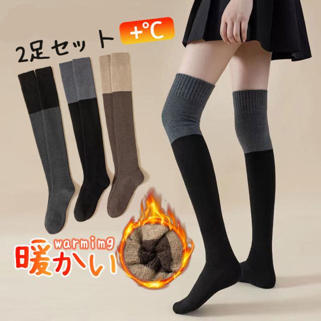 靴下 レディース 暖 2足セット ニーハイソックス ハイソックス 冬用 厚手 裏パイル 冷え取り 保温 綿混 発熱 着圧 弾性抗菌