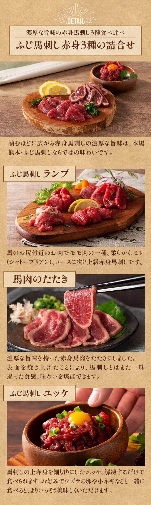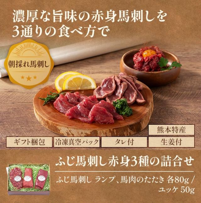 ふじ馬刺し 赤身3種の詰合せ 3種 4人前 210g ギフト ランプ、たたき 各80g ユッケ50g 送料無料 お取り寄せ 食べ比べ 熊本 赤身 霜降り