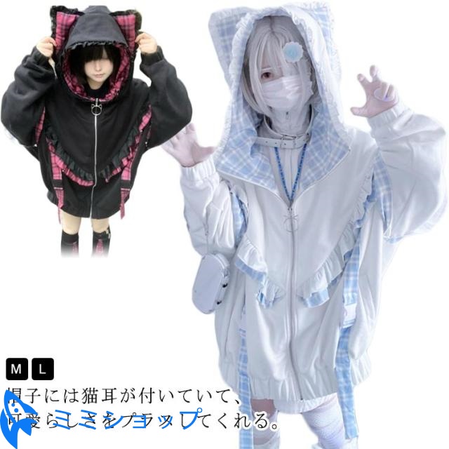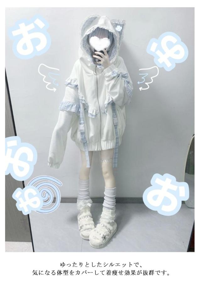 | 帽子には猫耳が付いていて、可愛らしさをプラスしてくれる。 袖に取り外し可能な帯をつけることによって華やかさがUP。 ゆったりとしたシルエットで、気になる体型をカバーして着痩せ効果が抜群です。 カジュアルなスタイルで、いろんなボトムスとの相性抜群で着回し力が良いです。 量産型、地雷系、天使界隈、サブカル系コーデにおすすめです。 女子会、デートなど様々なシーンで幅広く活躍中。お洒落で可愛いデザインで、プレゼントとしてもピッタリです。 | |