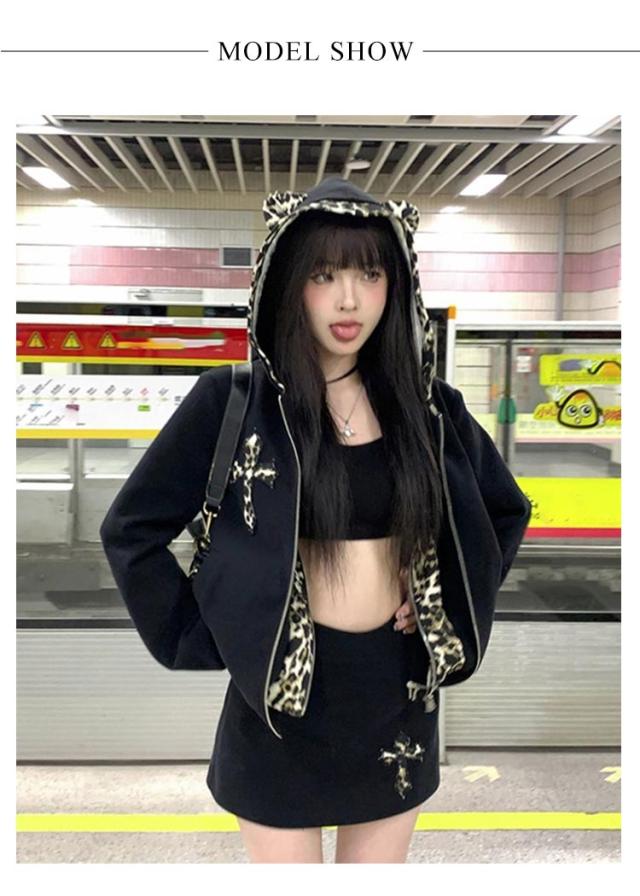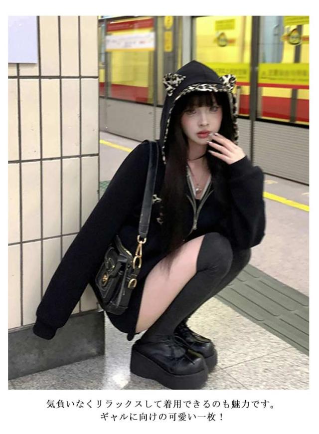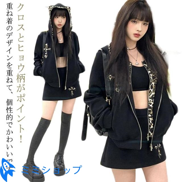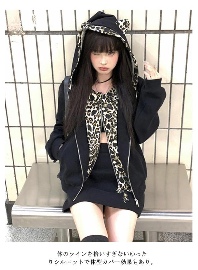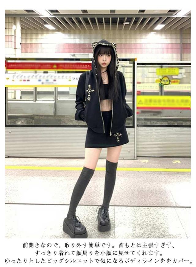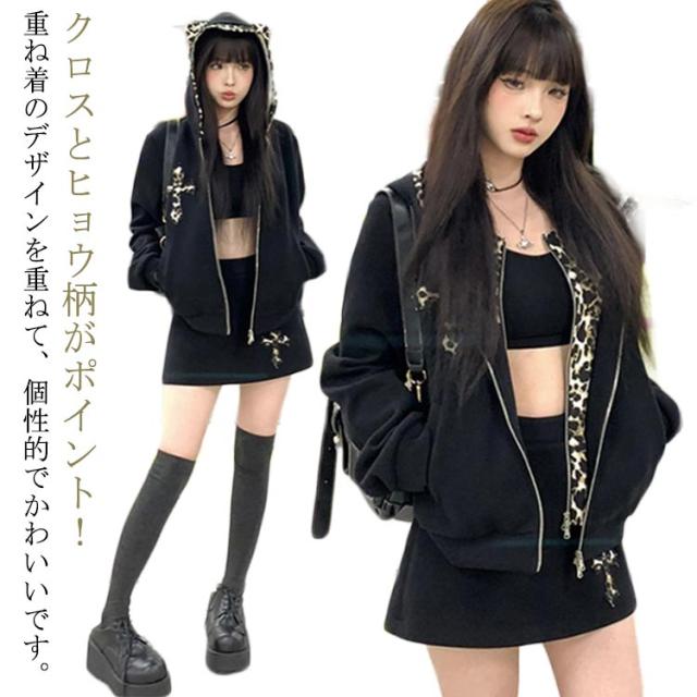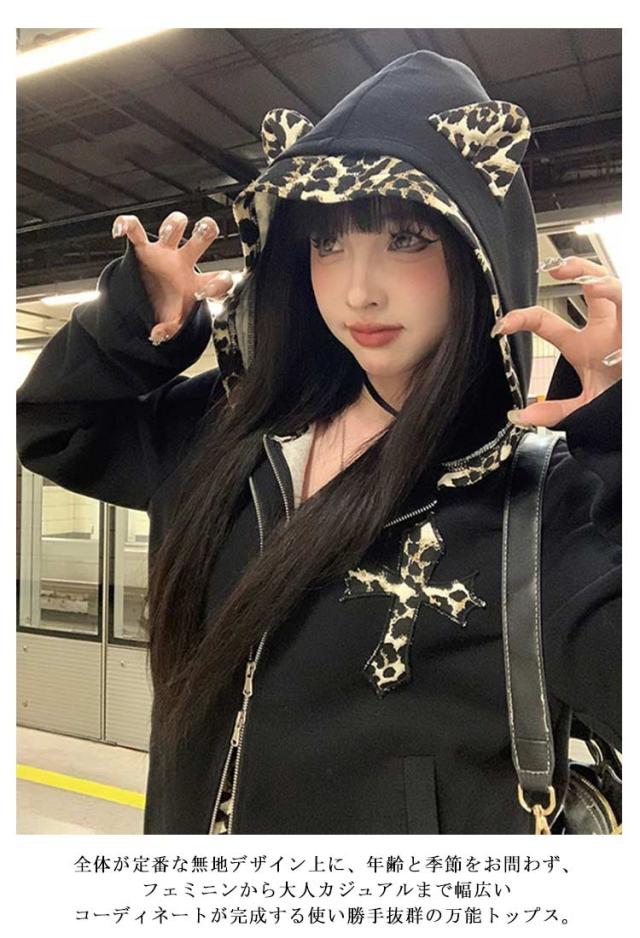 パンク風 クロス パーカー 可愛い 地雷系 ヒョウ柄 地雷系 長袖 少女 レディース 原宿系 重ね着 着?せ 渋谷系 姫系 病み系 フード付き ギャル服 量産型 サブカル系 ストリート系 耳付き 普段着 春秋 男女兼用 運動服
