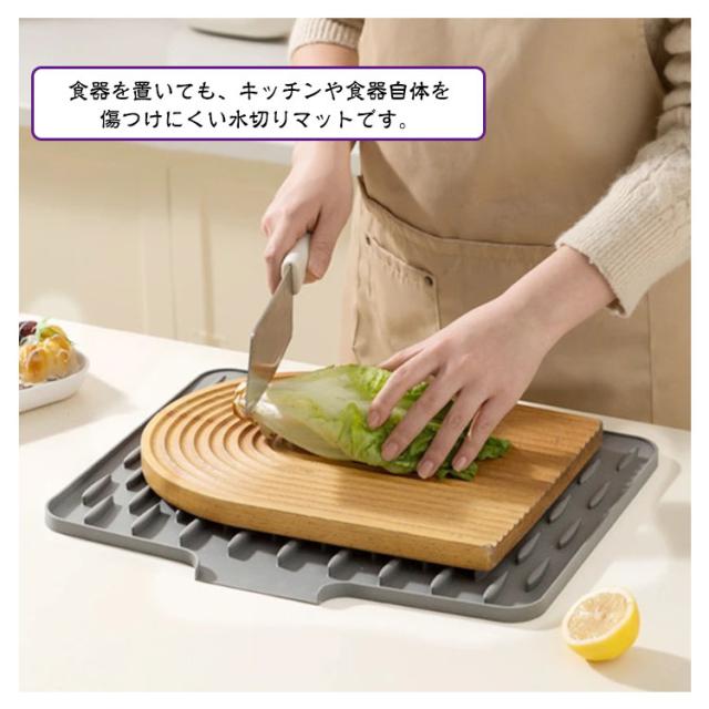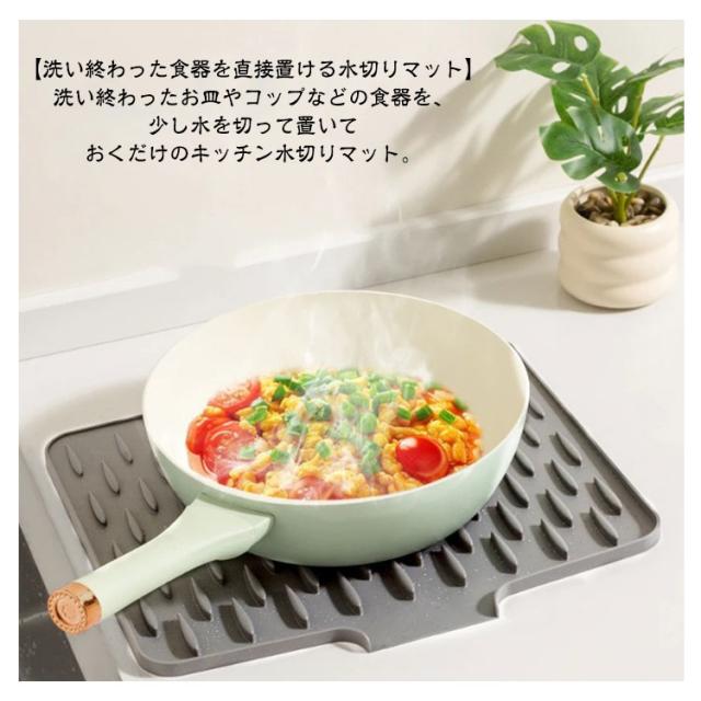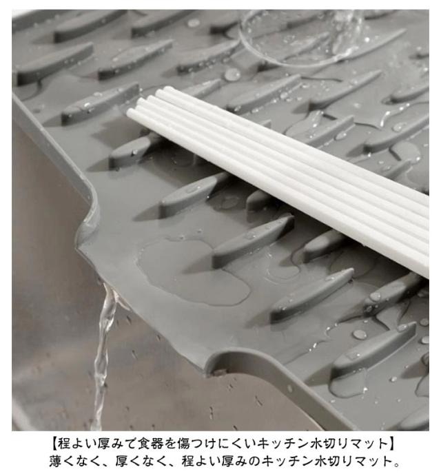 | 【水切りマット】 【シリコン】 【キッチンを濡らさずに清潔に保つキッチン水切りマット】 洗った後の食器置き場としてオススメのキッチン水切りマット。吸水マットなので、シンクなどを直接濡らさずに、キッチンをいつも清潔に保ってくれる水切りマットです。 【洗い終わった食器を直接置ける水切りマット】 洗い終わったお皿やコップなどの食器を、少し水を切って置いておくだけのキッチン水切りマット。 【程よい厚みで食器を傷つけにくいキッチン水切りマット】 薄くなく、厚くなく、程よい厚みのキッチン水切りマット。 食器を置いても、キッチンや食器自体を傷つけにくい水切りマットです。 | |
