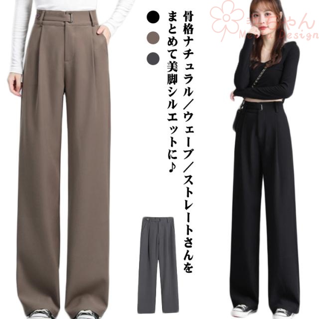 ハイウエスト 美脚 脚長 ストレートパンツ レディース ボタンストラップ ワイドパンツ 女性 ボトムス ワイド パンツ ハイウエストパンツ ズボン 長ズボン ロングパンツ スリム スタイルアップ ウエストゴム ゆったり きれいめ