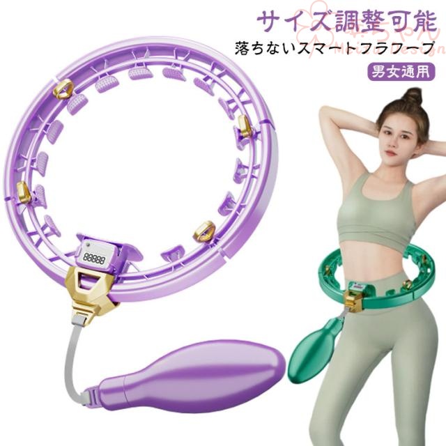 | 【落ちないスマートフラフープ】 【サイズ調整可能】 【毎日30分の運動で脂肪燃焼効果を実感】 スマートフラフープをまわすことにより、腰痛防止や骨盤矯正マッサージなどの効果があり、基礎代謝を高めてくれます。基礎代謝が高まることで脂肪を燃焼させ、インナーマッスルが強化されてキレイなくびれを作ることができます。また、便秘解消にも効果があります。デスクワークで普段運動を全くしないという方にはぜひおすすめです。1週間に5回、1日30分運動することでおよそ800カロリーを消費する可能性があります。 【大きなスマートカウンターでまわした回数を正確にカウント!】 自分で回数をカウントすると、疲れてきたり夢中になってしまうと正確な回数をカウントすることが難しくなってしまいますよね。ですがこちらの商品でしたらスマートカウンターがまわした回数を正確にカウントしてくれますので、自分で回数を数える煩わしさから解放してくれます。スマートカウンターが大きくて文字が見やすいのも魅力チップ搭載でリアルタイムで正確にカウントしてくれます。 【マッサージ効果ありで気持ちよく脂肪燃焼をサポート】 改良したマッサージヘッドがピッタリフィットして深部までマッサージ効果あり。気持ちよく脂肪燃焼をサポートしてくれます。ソフトヘッドなので肌に優しいのも嬉しいポイント360°からマッサージしてくれるので、心地よい振動で普通のフラフープよりも高い脂肪燃焼効果が期待できます。 | |