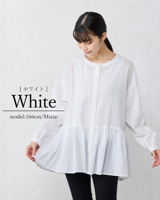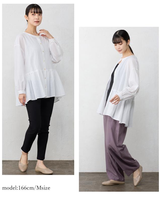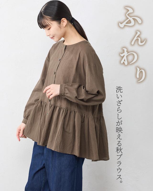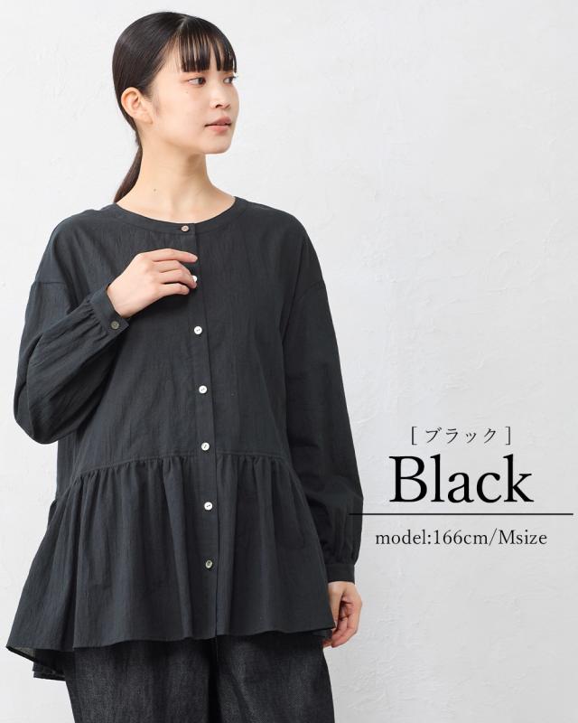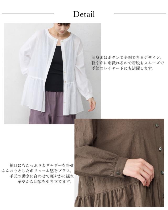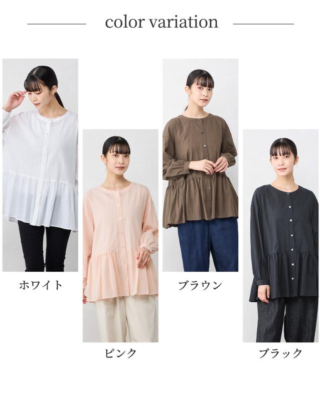 【日本製】ブラウス シャツ 長袖 綿100 ナチュラル ノーカラー トップス レディース ギャザー チュニック フリル フレア バンドカラー ノーカーラー 羽織 きれいめ 無地 体型カバー 皺加工 ワッシャー 白 黒 秋 冬 レイヤード 30代 40代 50代 60代 ゆったり 体型カバー