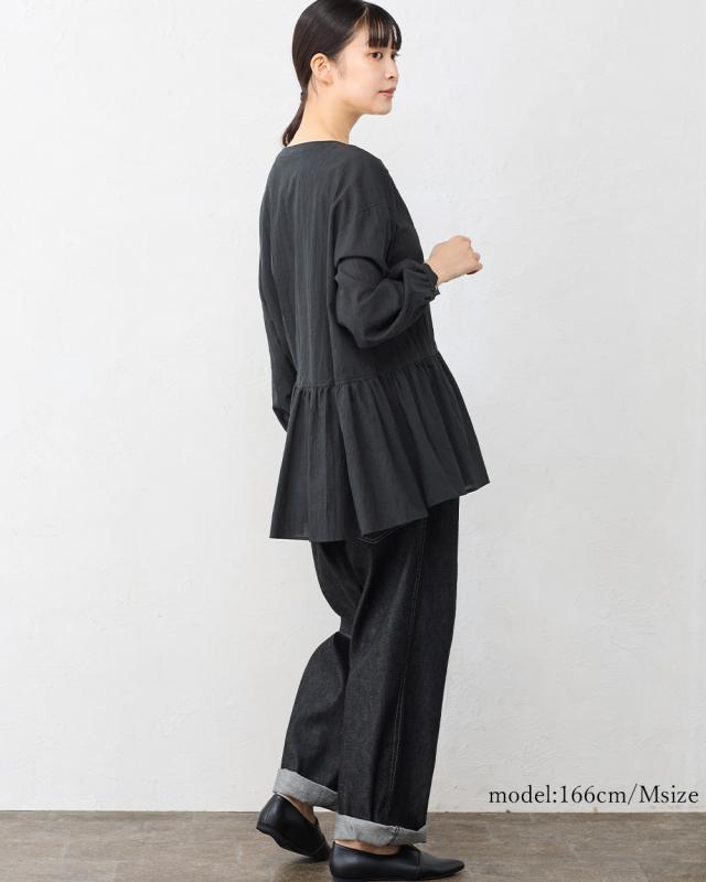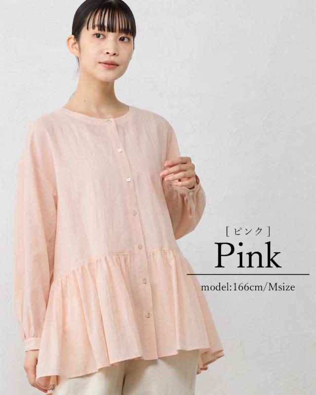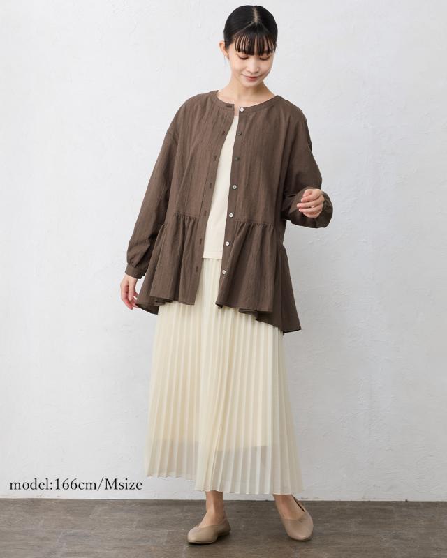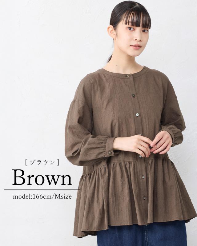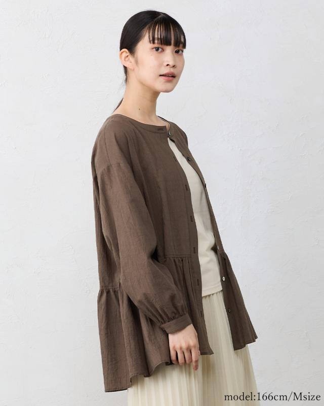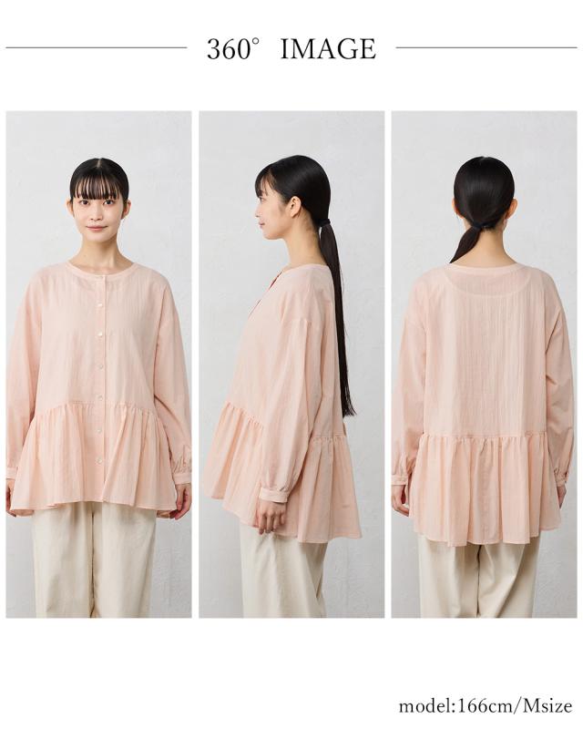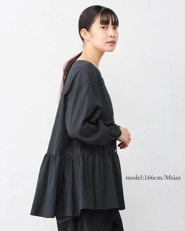 【日本製】ブラウス シャツ 長袖 綿100 ナチュラル ノーカラー トップス レディース ギャザー チュニック フリル フレア バンドカラー ノーカーラー 羽織 きれいめ 無地 体型カバー 皺加工 ワッシャー 白 黒 秋 冬 レイヤード 30代 40代 50代 60代 ゆったり 体型カバー