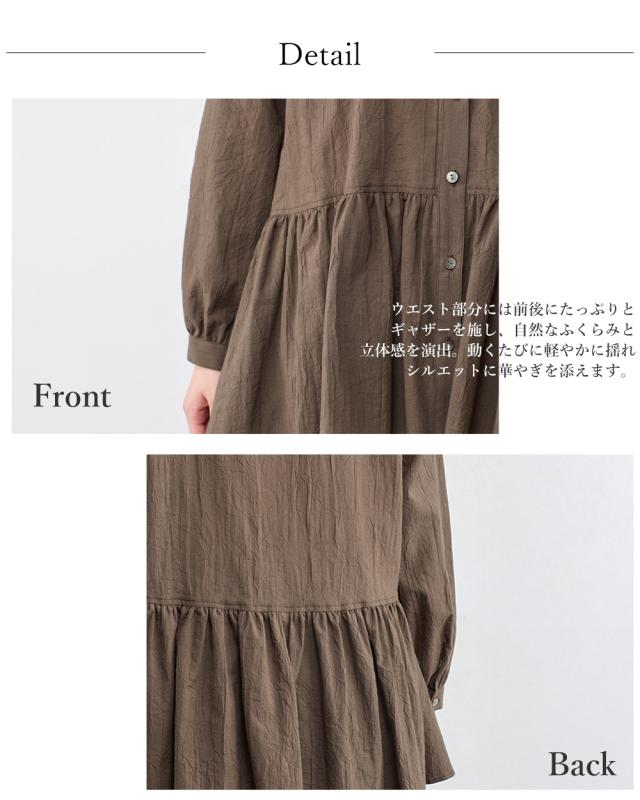襟元はすっきりとしたデザインで、前後にたっぷり入れたギャザーがふんわり揺れ、