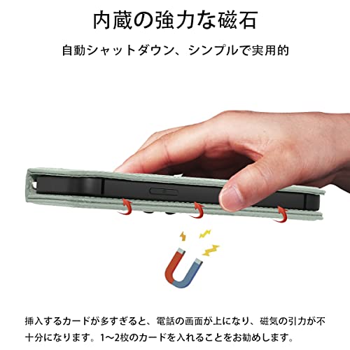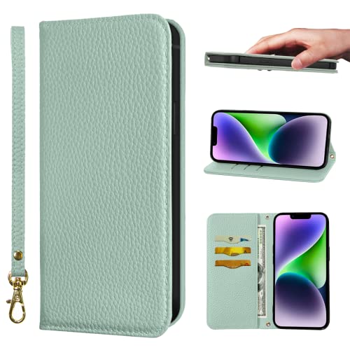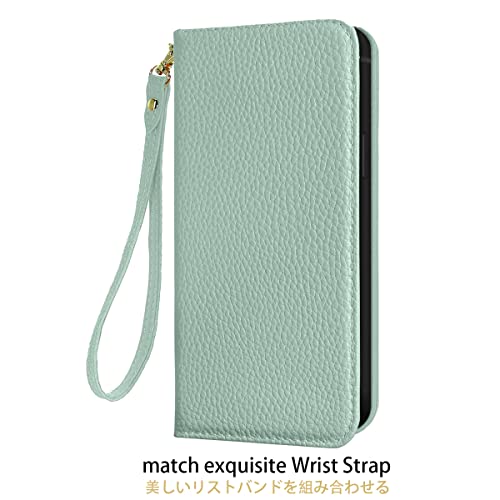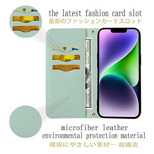 iPhone 14 ケース 手帳型 合皮レザー RFIDブロッキング 財布型 カバー 手帳型ケース 耐衝撃 保護カバー 内蔵マグネット携帯カバー カードポケット スタンド機能 リストバンド - ライトグリーン 送料無料