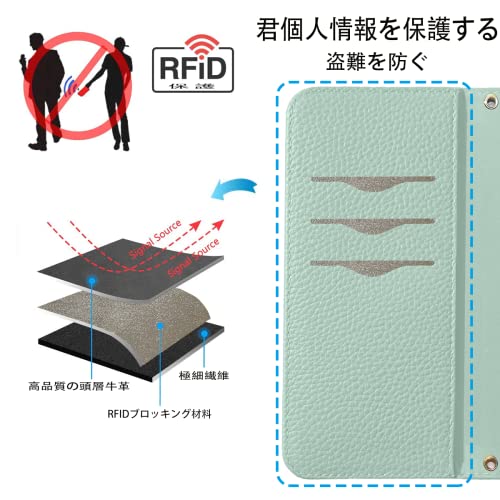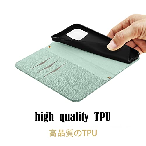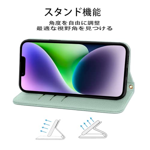 iPhone 14 ケース 手帳型 合皮レザー RFIDブロッキング 財布型 カバー 手帳型ケース 耐衝撃 保護カバー 内蔵マグネット携帯カバー カードポケット スタンド機能 リストバンド - ライトグリーン