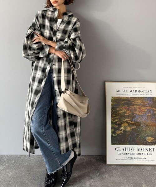 【25AW新作】着方自在でロングシーズン活躍◎柄アソートバンドカラービッグシャツワンピ