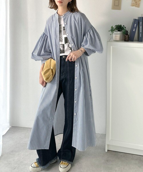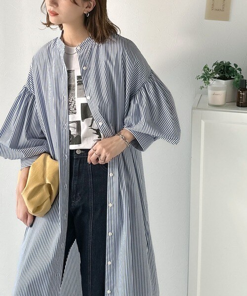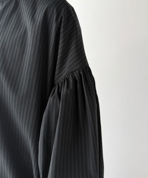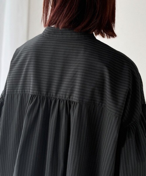 首元はすっきりとしたバンドカラー仕様で、全体にたっぷりギャザーを施したボリューム感のあるシャツワンピース。