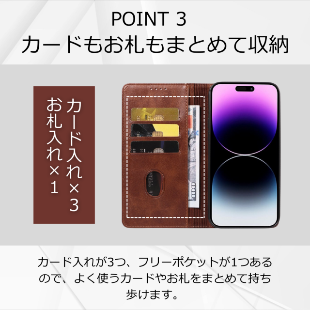 収納:カードポケット×3、紙幣やレシートが入るフリーポケット×1