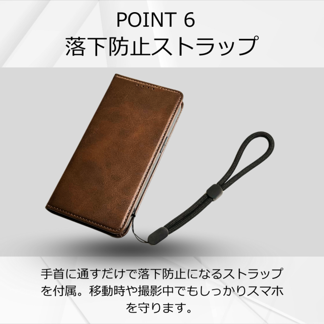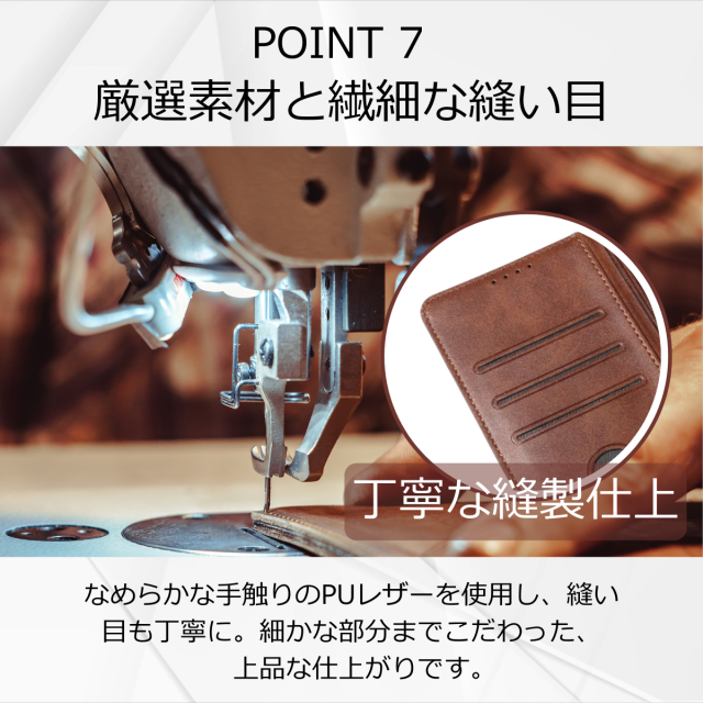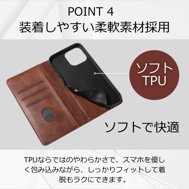 外側は高級感のあるPUレザー、内側は衝撃をやわらげるTPU素材を採用し、大切な端末をしっかり保護します。