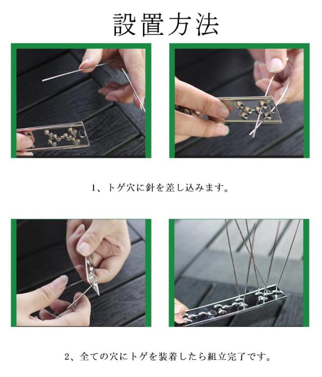 | 金属製の鳥よけスパイクで、鳩やカラス、猫の侵入をしっかりガード! 耐候性に優れている・錆びないステンレスを使用しているので、長期間使用できます 。 工具不要で、狭い場所や曲がった場所にも自由に配置できます。 縦横設置のトゲが交互についていることにより、鳥が侵入できる隙間をより小さく。 鳥・カラス・野獣・野良猫に繰り返し侵入される家屋に適用。 ベランダ、屋根、窓のひさし、畑、フェンス、エアコン室外機など、幅広い場所に対応。 設置方法 1、トゲ穴に針を差し込みます。 2、全ての穴にトゲを装着したら組立完了です。 3、設置前に設置場所を清潔にして下さい。 4、設置場所に合わせた設置方法で固定してください。 両面テープ、接着剤、ネジ、けっそl九番度などで固定が可能 | |