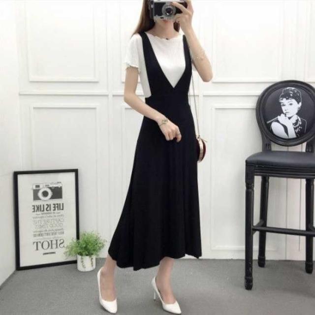 ジャンパースカート サロペット 深Vネック ワンピース ロング ジャンスカ レディース ノースリーブ オールインワン 春 夏 秋冬 大人 フレア きれいめ ママ おしゃれ 大きいサイズ 20 ブラック