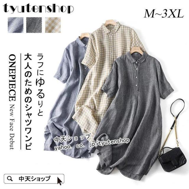 シャツワンピース レディース 40代50代 半袖ワンピース 夏 チェック柄 リネンワンピース おしゃれ カジュアルワンピース ミモレ丈 気質 大人