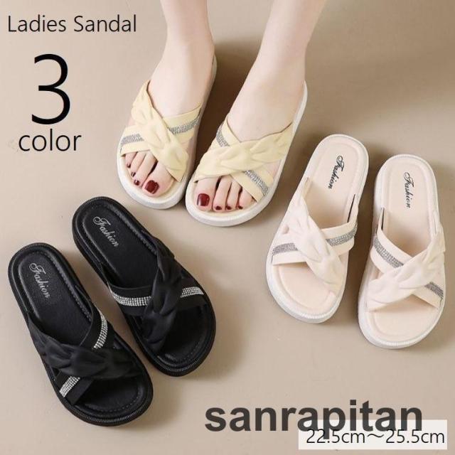 【タイムセール】サンダル 厚底サンダル スリッパ フラットサンダル つっかけ レディース 女性 婦人 靴 くつ クロス ラインストーン ぺたんこ かわいい おしゃれ