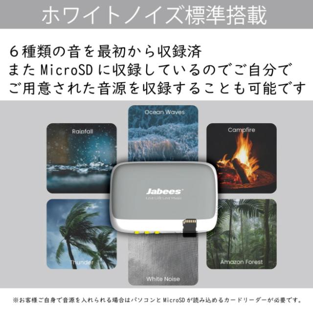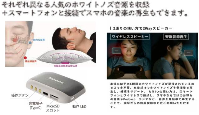 ■持ち運びに便利な超小型コンパクトサイズのバッテリー搭載骨伝導式スピーカー!イヤホンや通常のスピーカーではなく、周波振動で音を伝達し骨伝導を主体に伝えるため耳(鼓膜)が疲れにくく、自然に音をとらえられるため入眠のサポート、ゴロ寝スピーカーとして最適です。■2通りの使い方!●スマートフォンなしで、本製品単体でホワイトノイズを再生するスピーカーとして!●スマートフォンとワイヤレスで接続し音楽(動画音声OK)を流すスピーカーとして!■リラックス状態へと導くホワイトノイズで自然な入眠を促進!忙しい頭の中の雑念をかき消し、穏やかな眠りへの誘導してくれます。 ■スマートフォンの電磁波を避けたい時や、バッテリー節約のためBluetooth接続を切りたい時でも、内蔵のSDカードに収録された6種類の自然音が利用可能。厳選された雨音、森林音などが、デジタルデトックスしながらでも上質な睡眠環境を提供します。【注意事項】※密度が高い枕素材(例:低反発素材のマットや枕は、音や振動を吸音してしまうため伝わらないや伝わりにくい状況となります)で性能を発揮できません。