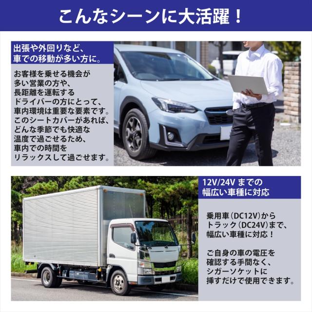 | 商品名 | DC12V・DC24V車対応 \COOL&HOTシートカバー/ 夏は涼しく冬は温かく 季節を問わず心地よいドライブを |
