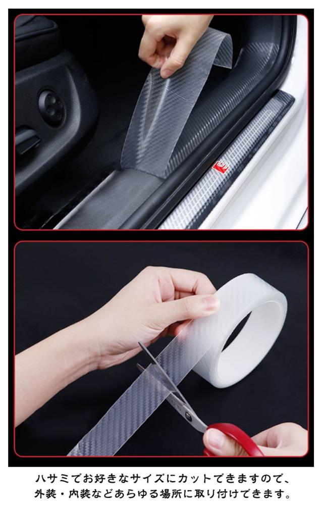 | 車の乗り降りの傷防止に最適!カーボン調の透明スカッフプレート。 上品に見えるカーボン調でサイドシル、バンパー、サイドミラーなどのキズ防止に大活躍。 透明なのでどんなカラーの車にも合わせやすく、違和感なくご利用いただけます。 ハサミでお好きなサイズにカットできますので、外装・内装などあらゆる場所に取り付けできます。 貼り付けるだけで傷防止に◎ 選べる4サイズなので、車はもちろん、バイクや、スマホ、タブレットなどのキズ防止にも◎ | |