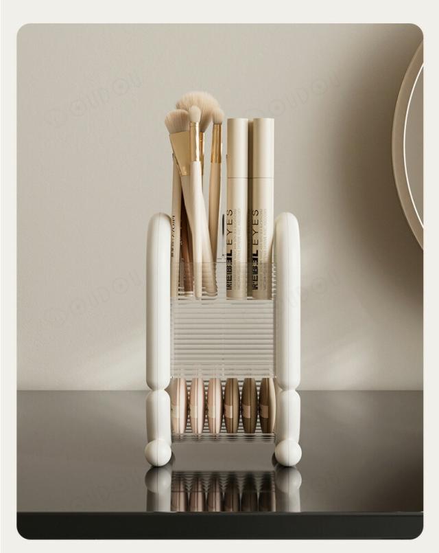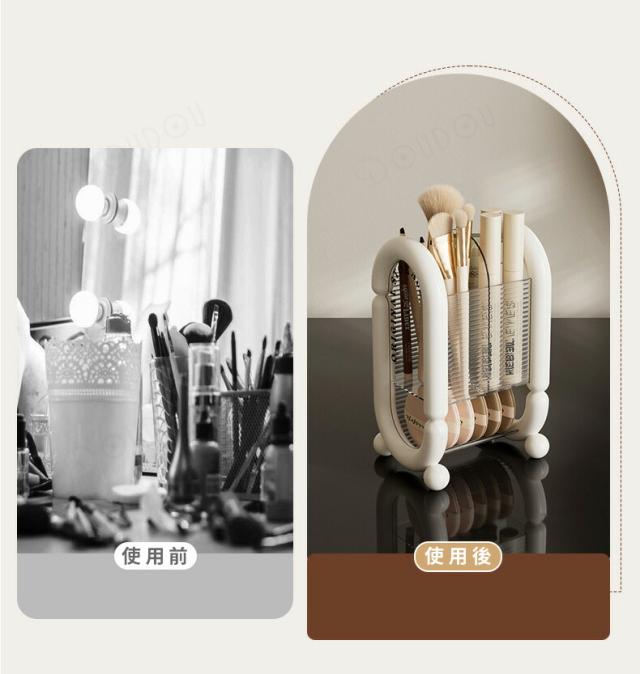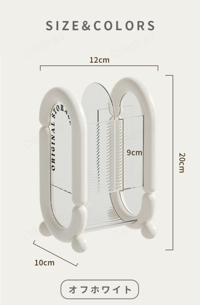 | 仕様 | 【 場所を取らずスッキリ収納 】 一般的な巻き型や折りたたみ型のブラシ収納ケースは、ブラシを取り出しやすい反面、スペースをとって戻しにくいというデメリットがあります。 立てて収納できるため、省スペース。ブラシを取り出しやすく、戻しやすいデザインです。 洗面所やドレッサーでも場所を取らず、スッキリとコスメ収納できます。 【 長めのブラシも収納可能 】 フタがついているスタンドは長めのブラシは収納できません。また、幅が広めの容器だと、ブラシが倒れたり、短いブラシは埋もれて取り出しにくかったりします。長めのブラシはもちろん、短めのブラシも取り出しやすい位置に収納可能。ちょっとした煩わしさがなくなります。 ?【 耐久性が高い高品質素材 】 クリアでおしゃれなデザインは丸洗いすることも可能。置き場所の雰囲気を選ぶことがありません。 素材にはファーストグレードのアクリルを採用。高い透明度に加え傷がつきにくく高い耐久性を備えています。贈り物としても最適です。 |