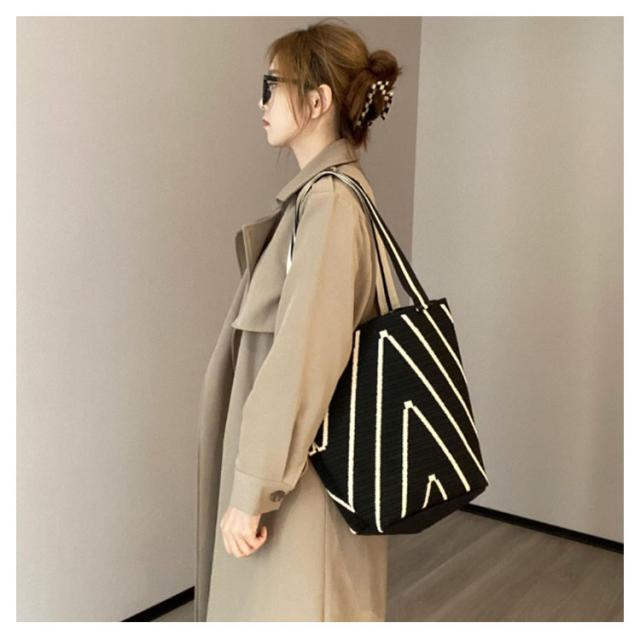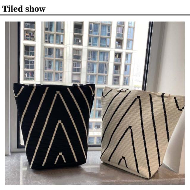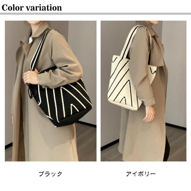 | コーデのワンポイントになる♪ シンプルなコーディネートにも映える幾何学模様の肩掛けバッグ。 モダンでおしゃれなバケツ型、マチあるから、たっぷり入れることができます。 コーデにも合わせやすく、見た目がシーズンムードを高めてくれるニットバッグ。 | |